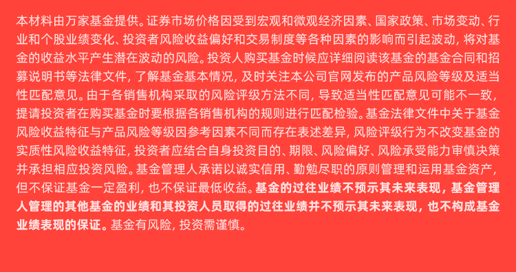 ]article_adlist-->风险提示:本材料由万家基金提供。证券市场价格因受到宏观和微观经济因素、国家政策、市场变动、行业和个股业绩变化、投资者风险收益偏好和交易制度等各种因素的影响而引起波动,将对基金的收益水平产生潜在波动的风险。投资人购买基金时候应详细阅读该基金的基金合同和招募说明书等法律文件,了解基金基本情况,及时关注本公司官网发布的产品风险等级及适当性匹配意见。由于各销售机构采取的风险评级方法不同,导致适当性匹配意见可能不一致,提请投资者在购买基金时要根据各销售机构的规则进行匹配检验。基金法律文件中关于基金风险收益特征与产品风险等级因参考因素不同而存在表述差异,风险评级行为不改变基金的实质性风险收益特征,投资者应结合自身投资目的、期限、风险偏好、风险承受能力审慎决策并承担相应投资风险。基金管理人承诺以诚实信用、勤勉尽职的原则管理和运用基金资产,但不保证基金一定盈利,也不保证最低收益。基金的过往业绩不预示其未来表现,基金管理人管理的其他基金的业绩和其投资人员取得的过往业绩并不预示其未来表现,也不构成基金业绩表现的保证。基金有风险,投资需谨慎。